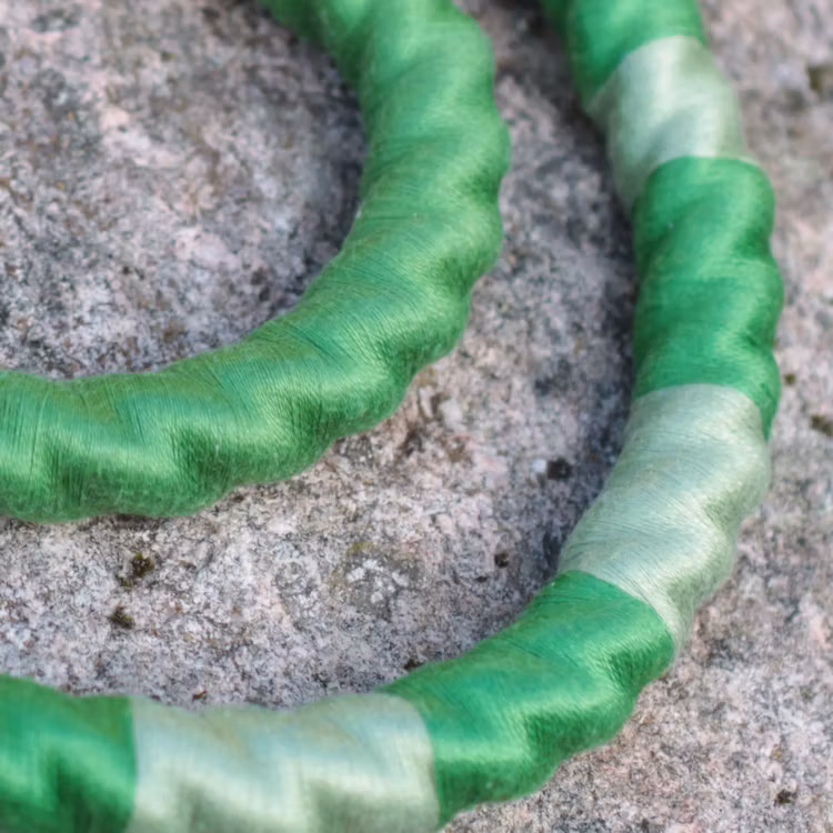 Handgjort rephalsband med matchande armband tillverkade av repstumpar som annars hade kastats och broderingsgarn från secondhand-butiker.