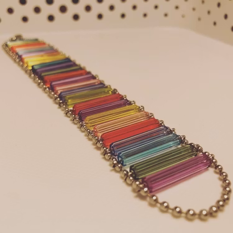 On-of-a-kind armband av avlånga plastpärlor i alla möjliga färger. Ca 20 cm långt inklusive lås.