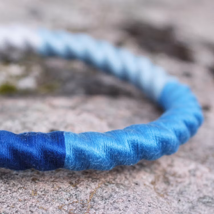 Handgjort rephalsband tillverkade av repstumpar som annars hade kastats och broderingsgarn från secondhand-butiker.