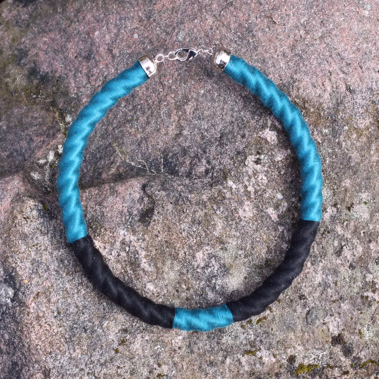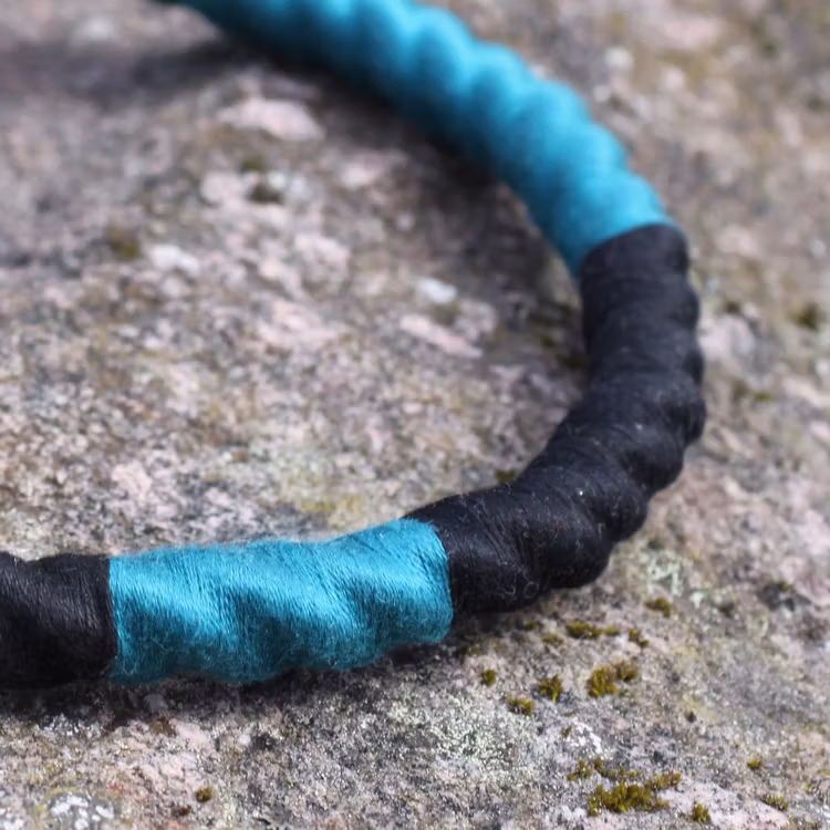 Handgjort rephalsband tillverkade av repstumpar som annars hade kastats och broderingsgarn från secondhand-butiker.