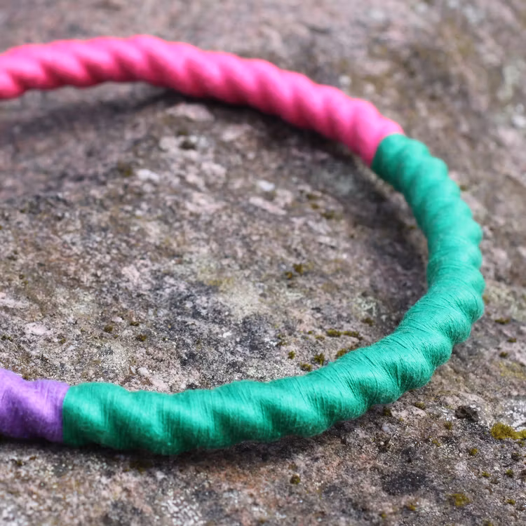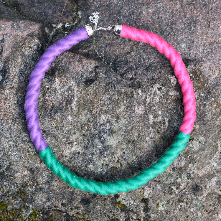 Handgjort rephalsband tillverkade av repstumpar som annars hade kastats och broderingsgarn från secondhand-butiker.